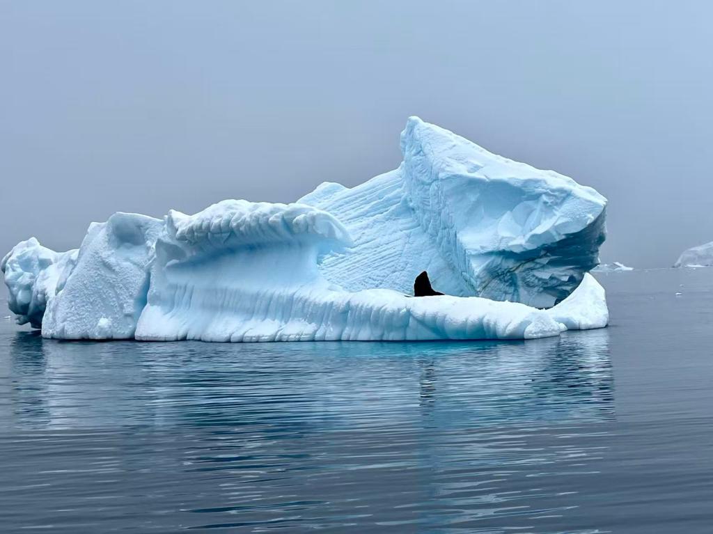 在南极中国长城站附近的海域中有大量成千上万年的蓝冰。这只海豹在这一小块的蓝冰上悠闲自得的摆动着身躯,不时向我们的冲锋艇抬头仰望,好像在向我们说:人类呀,我们共享这个世界的美好。