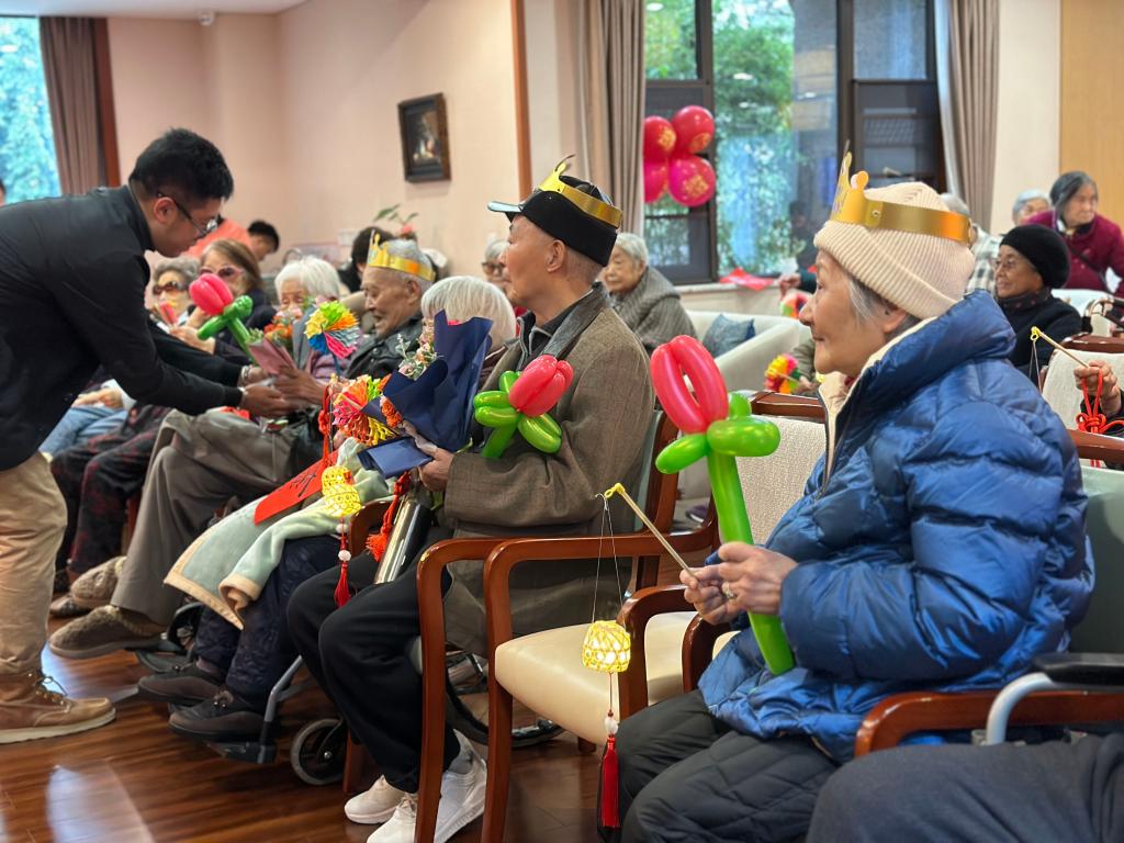 画面定格养老院中的动人瞬间:老人们头戴金色皇冠,手捧气球编织的花束,笑容如阳光般灿烂。工作人员俯身献花的姿态充满敬意与温暖,窗边飘荡的气球与满室暖光交织出梦幻般的氛围。这张照片以细腻的视角捕捉了长者被珍视的美好时刻,用明快的色彩和充满仪式感的场景,展现了社会对老年群体的人文关怀,传递出岁月有银丝,生命仍璀璨的温暖主题。