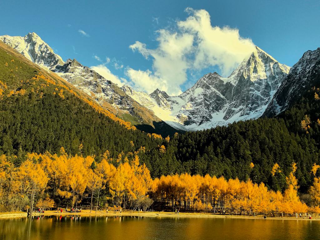 金秋时节,川西高原,雪山巍峨,峰顶积雪如银,在蓝天的映衬下愈发圣洁;山林层叠,金黄的落叶松似燃烧的火焰,与深绿的林木交织出斑斓的秋意;湖水静谧,如镜的水面将山与林的绚烂悉数收纳,展现出秋之韵色。