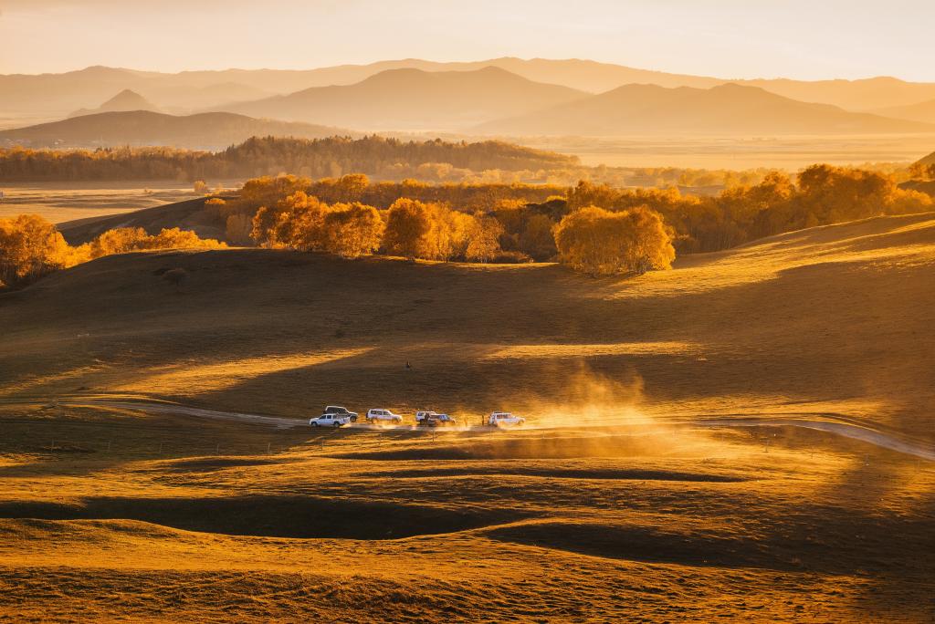 坝上的深秋,天地铺展成一片鎏金的画卷。四辆越野车驰骋于起伏的草丘之上,车轮卷起轻尘,在低斜的日光中晕染出朦胧的光晖。近处秋树疏朗,叶片烁金;远山层叠,柔蓝的雾霭轻抚山脊。侧逆光深刻勾勒出丘陵的轮廓,草色如波,光影流动,完美融合了荒野的辽阔与生命的动感,凝刻下秋日最炽烈而宁静的诗意瞬间。