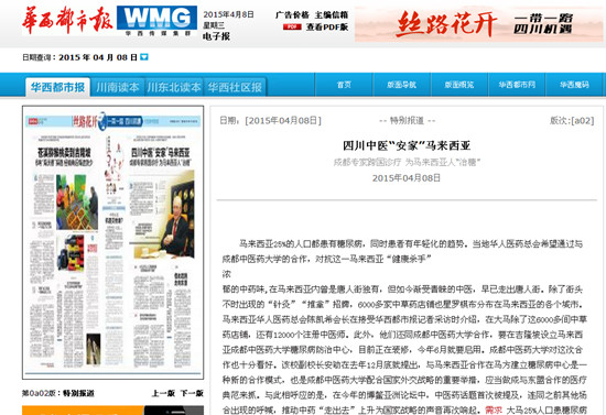 2015年4月8日,《华西都市报》特别报道我院与马来西亚建立糖尿病中心。