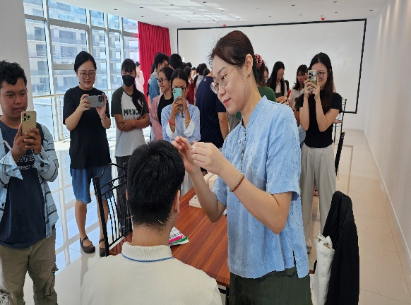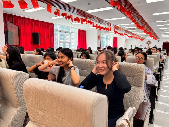 医疗队队员、我院针灸科郭航为师生们讲解了中医适宜技术的相关知识,包括针灸、拔罐、刮痧的适应症、禁忌症、操作方法、注意事项等内容,并根据柬埔寨当地气候环境特点,深入浅出地展示了中医适宜技术在治疗常见病中的应用。会后,医疗队队员们演示了针灸、刮痧、拔罐的操作手法和中医望、闻、问、切诊断疾病的基本内容,并赠送中药防病香囊。队员们动作精准、手法娴熟,师生们热情高涨、踊跃参与,现场气氛热烈。