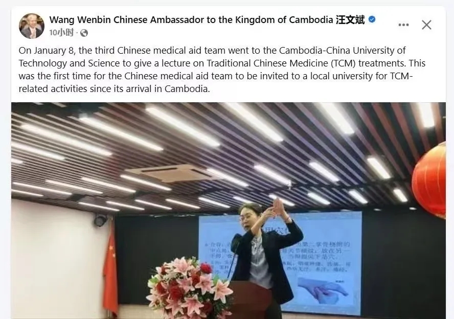 1月8日,由四川整建制组建的第三批中国援柬埔寨中医医疗队走进柬华应用科技大学开展中医适宜技术宣讲活动。这是医疗队赴柬工作来第一次受到柬埔寨当地大学的邀请而开展的活动。