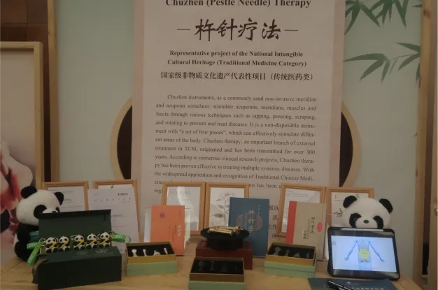 “四川中医药”展览分别设置在三楼和五楼会场区域,以“畅游中医之乡、探索中药之库”为主题,分为“万物之源,药韵悠悠”、“川医源流,针药并重”、“扬中华文化,促杏林合作”三个版块,通过天回医简(复制品)、老官山经穴髹漆人像(复制品)、北宋针灸铜人(复制品)、近代巴蜀名医处方真迹、川产道地药材、现代中药制剂、国家级非物质文化遗产李仲愚杵针疗法、中医药大健康产品等实物展示,以及现场讲解、多媒体互动、非药物疗法体验等方式,向世界展示了四川丰富的中医药资源和中医药产业发展的创新成果。展出期间,除了由我院精选提供的20余种特色院内制剂、膏方等产品深受欢迎外,在我院杵针团队体验区的中外嘉宾更是排起了长队等候体验。