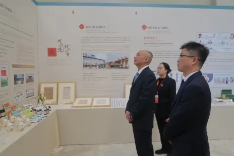 11月12日,2024年四川国际友城合作与发展大会在成都开幕。期间,由四川省中医药管理局主办、我院承办的“四川中医药”展览活动同步举行。四川省中医药管理局党组书记、局长田兴军出席会议并参观展区。四川省中医药管理局对外合作处副处长(主持工作)陈莹、我院党委副书记樊效鸿现场指导展陈工作。