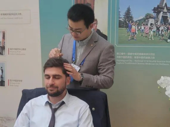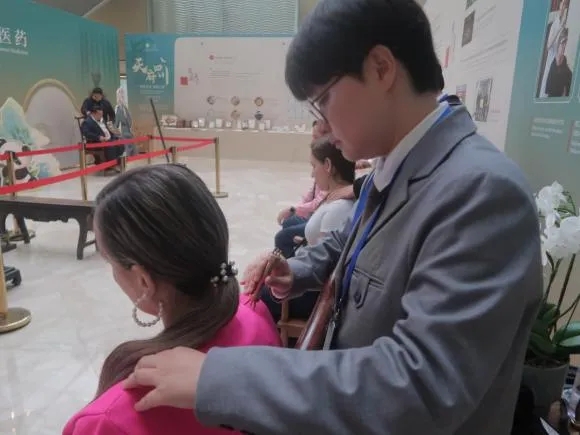 一位来自吉尔吉斯斯坦的外宾在体验杵针疗法时表示:“我身后的工作人员正在用她的工具触碰我的头,按摩我的穴位,我感觉很好,很放松。”