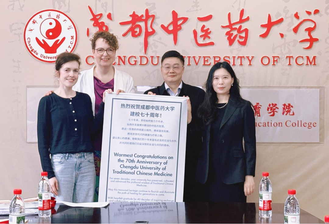 4月13日上午,德国传统中医针灸学会短期研修班开学典礼在学校举行。学校基尔健康医学院副院长陈云慧、我院副院长陈秋出席,对德国医师学员表示欢迎。陈秋回顾了四十余载合作情谊,并介绍学校70周年办学成就。学员领队希尔特鲁德·维特医生和夏霓雅医生代表全体学员发言,感谢学校及我院的周到安排,并代表学会向学校建校70周年赠送祝福锦旗,祝愿中医药智慧薪火相传、蓬勃发展。