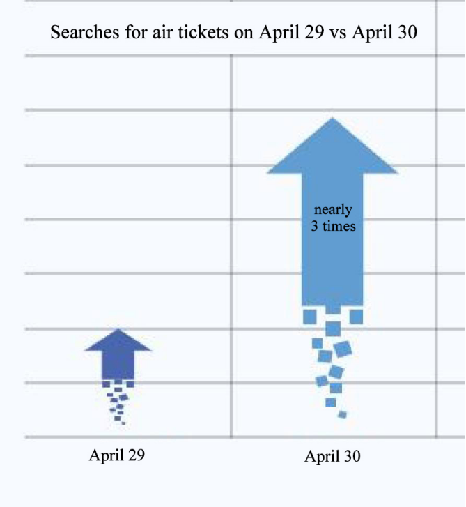 在线旅游平台艺龙表示,4月30日至5月3日期间的机票在线搜索量激增,4月30日的机票搜索量几乎是4月29日的三倍,而5月1日的机票搜索量则超过了其它几天。