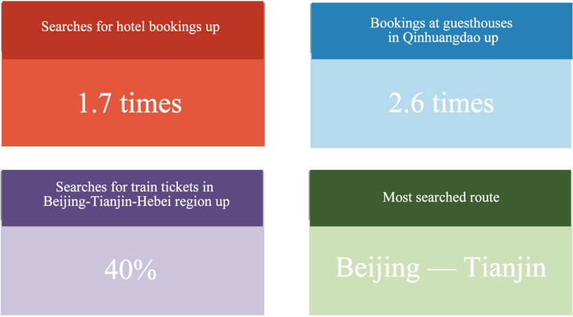 Data from the travel platform Qunar.com published on April 20 also showed searches for May Day holiday hotel bookings increased 1.7 times between April 18 – 20 from a week earlier, after news was released that one's health status would be mutually recognized in the Beijing-Tianjin-Hebei region. Searches for train tickets in the Beijing-Tianjin-Hebei region rose by 40 percent, with Beijing-Tianjin travel the hottest route. And bookings for hotels in Qinhuangdao jumped 2.6 times.