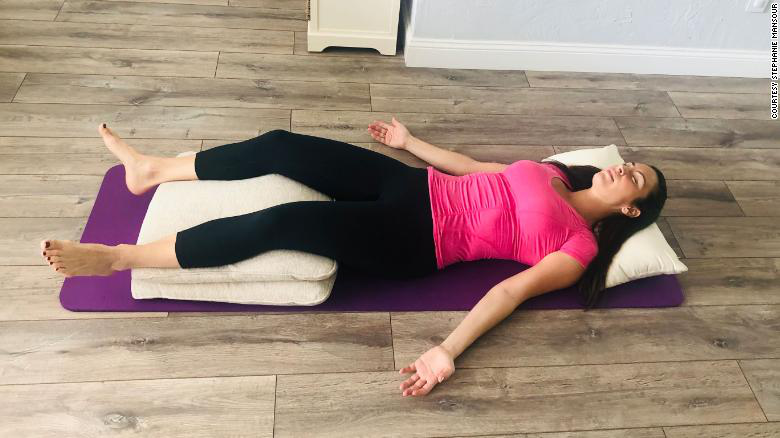 Instead, try doing a yoga pose called Savasana with lots of props. Lie down on the ground. Place a bolster or pillows underneath your knees, and a pillow underneath your head. Relax your arms by your sides with the palms face up.