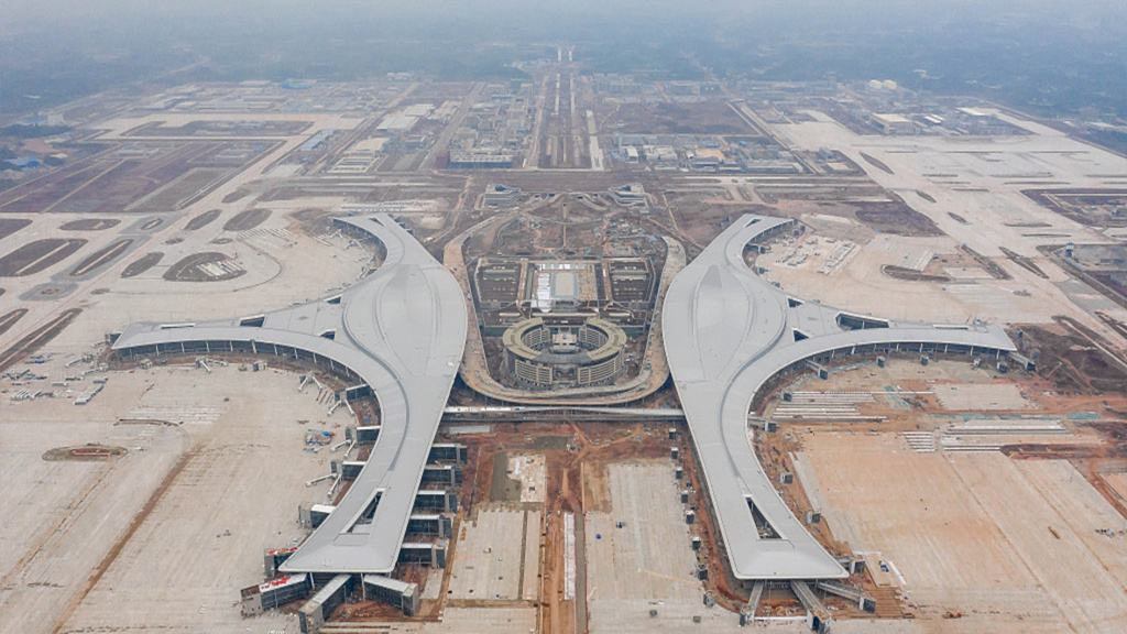 An aerial view of Tianfu International Airport, which is in trial in Chengdu, southwest China's Sichuan Province. /CGTN
