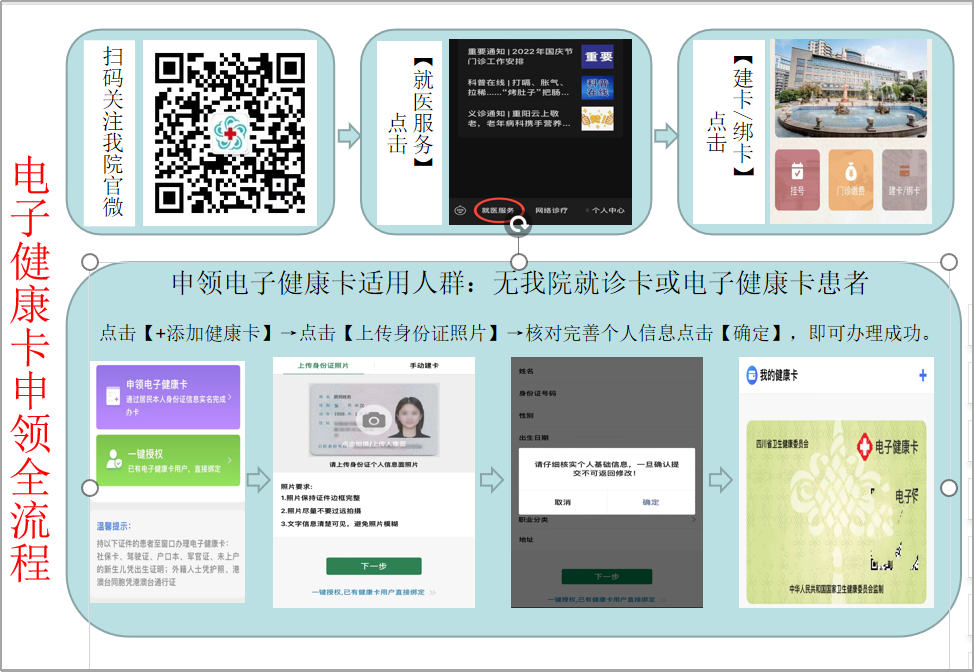 答:关注我院微信公众号【成都中医附院 四川省中医院】→就医服务→建卡/绑卡→添加健康卡(注册时请仔细核对个人信息、联系电话,避免预留信息错误)。