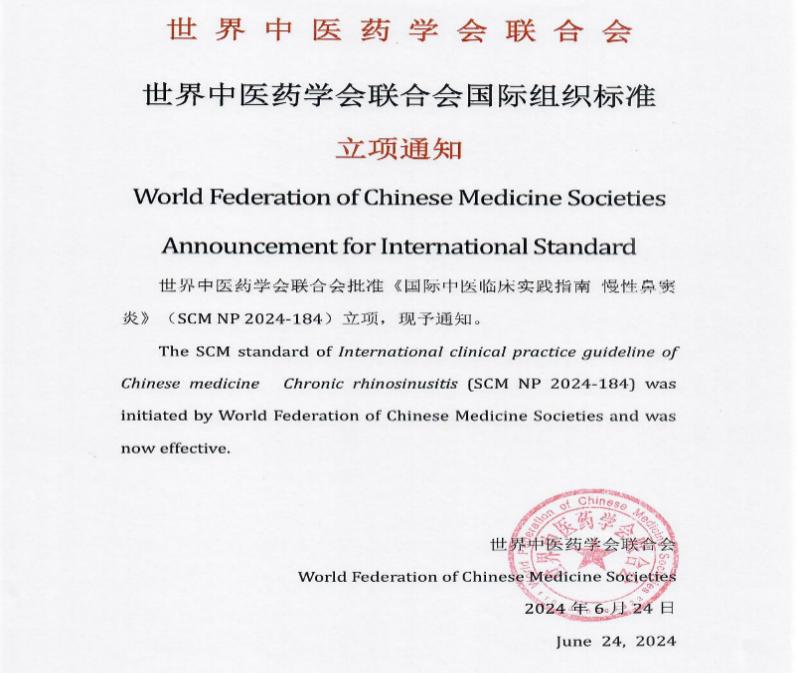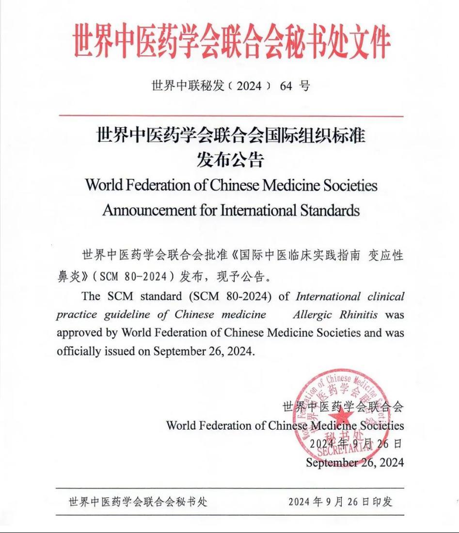 日前,世界中医药学会联合会公布了《国际中医临床实践指南 变应性鼻炎,SCM 0080-2024》发布公告。