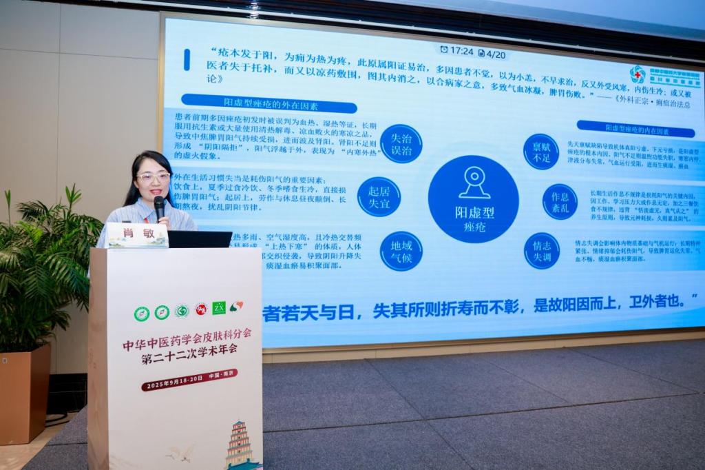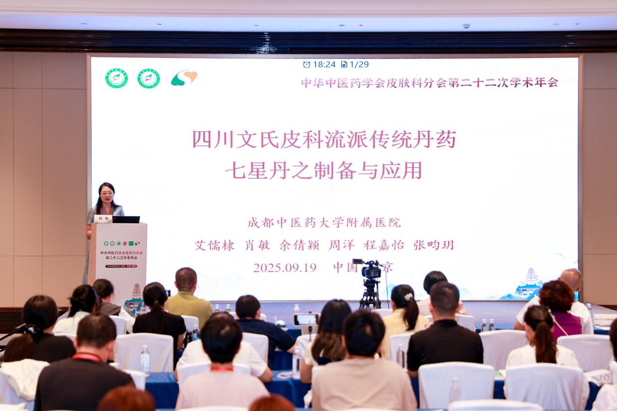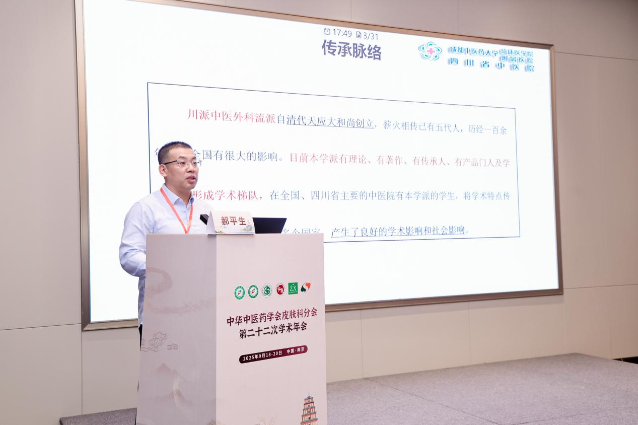 9月18-20日,中华中医药学会皮肤科分会第二十二次学术年会于江苏省南京市成功举行,本次会议汇聚了全国名老中医和皮肤科领域的权威专家与青年学者,围绕皮肤科当前的热点和难点议题展开深入研讨,吸引了来自全国各地1400余名皮肤科医师参会。我院皮肤科艾儒棣教授、陈明岭教授、郝平生教授、郭静教授、肖敏教授、余倩颖副主任医师受邀参加,聚焦中医皮肤科前沿领域作相关专题报告,内容涵盖名老中医辨证思路、创新性理论研究、川派文氏皮外科外治法特色、传统丹药制备与临床应用等多个方向。