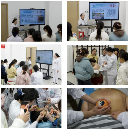 在工作坊环节,我院针灸科护士长杨淑艳、护士唐欣和陈芋名为学员进行了肿瘤患者适宜中医护理技术讲解并实操演示,包括耳穴综合疗法、腕踝针、刮痧、火龙罐等技术。通过现场示范,进一步强化了大家对实用中医护理技术的掌握。