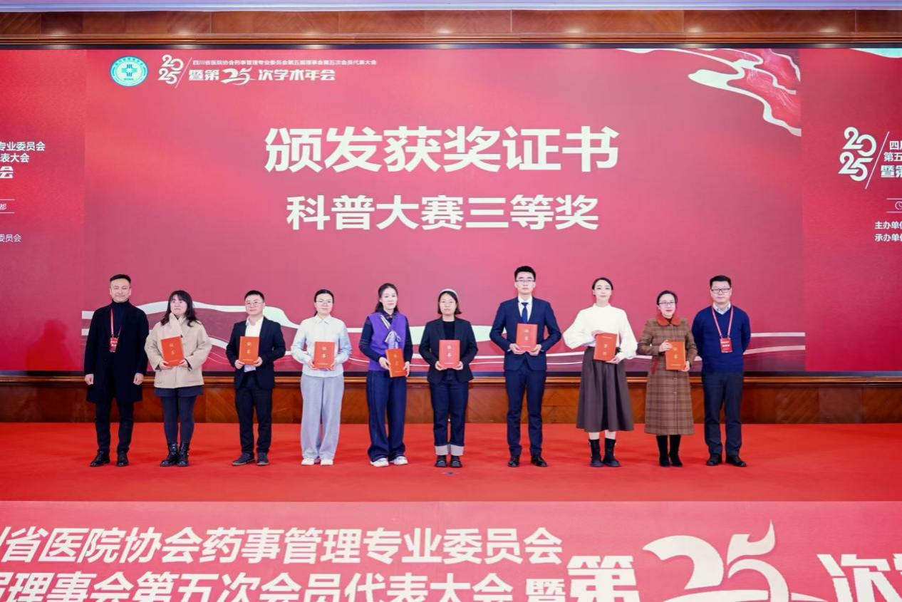 此前,我院药剂科在成都药学会主办的“健康‘药’知道,科普大赛行”中同样表现出色。梁倩中药师在谢凡副主任中药师的指导下,撰写的科普文章获得市级二等奖,梁倩、祝华莲、李雪三位中药师制作的科普视频获得市级三等奖。在“‘药’你安全,老年人安全用药小课堂”科普比赛中,刘晓波、袁丽、黄宁、林含露四位药师共同制作的作品获得了省级入围奖。