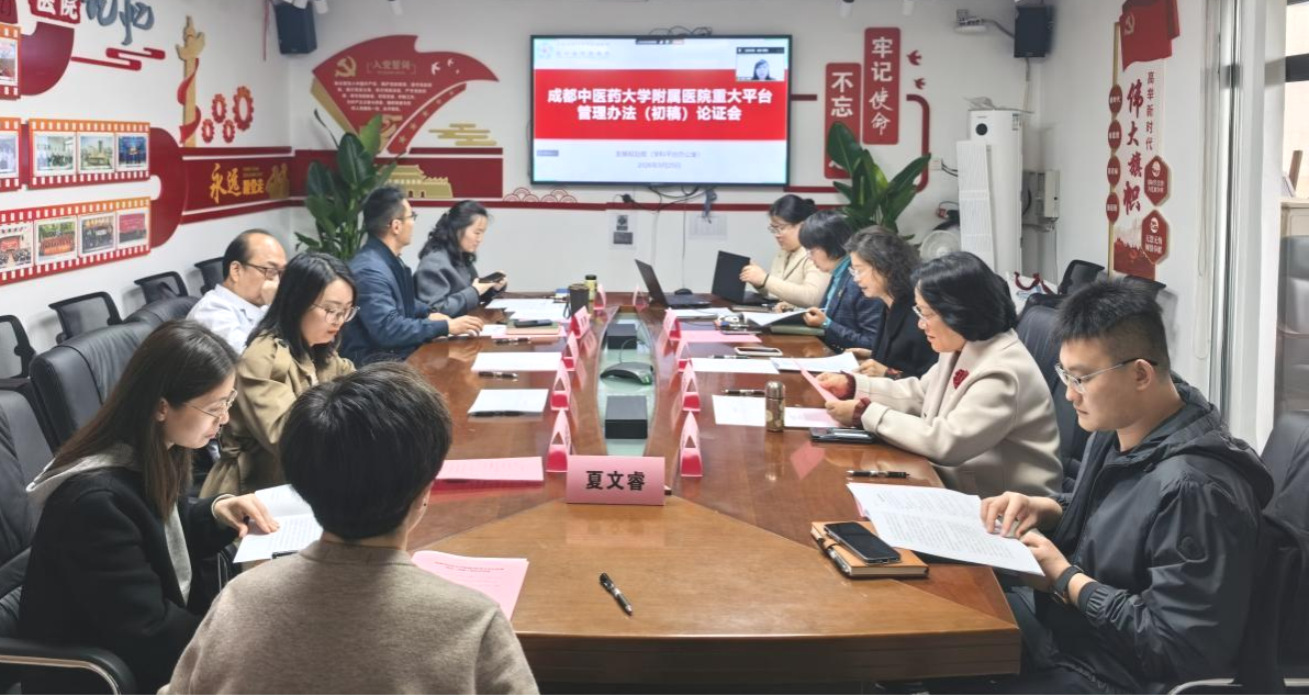 3月25日上午,我院组织召开《成都中医药大学附属医院平台管理办法(初稿)》论证会,旨在规范平台建设、运行、评估与成果转化全流程管理,以制度保障医教研协同高质量发展。成都中医药大学药学院副院长裴瑾、医院高原共病研究院执行院长孟宪丽、国有资产管理部(招标采购中心)副主任杨雪、科研部副部长高泓及各省级临床医学研究中心、省重点实验室专家代表参会,会议由医院发展规划部(学科平台办公室)部长郭静主持。